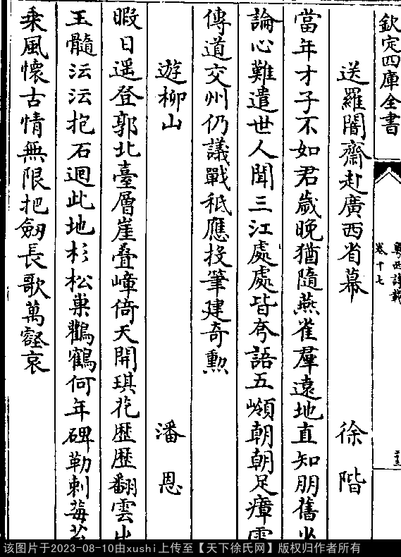 送罗闇斋赴广西省幕 明 · 徐阶 七言律诗 押文韵 出处:粤西诗载卷十七 当年才子不如君,岁晚犹随燕雀群。 远地直知朋旧少,论心难遣世人闻。 三江处处皆夷语,五岭朝朝足瘴云。 传道交州仍议战,秪应投笔建奇勋。 出处: 《粵西詩載-清-汪森》卷十七(第 23b - 24a 頁)