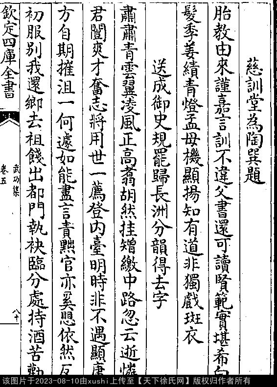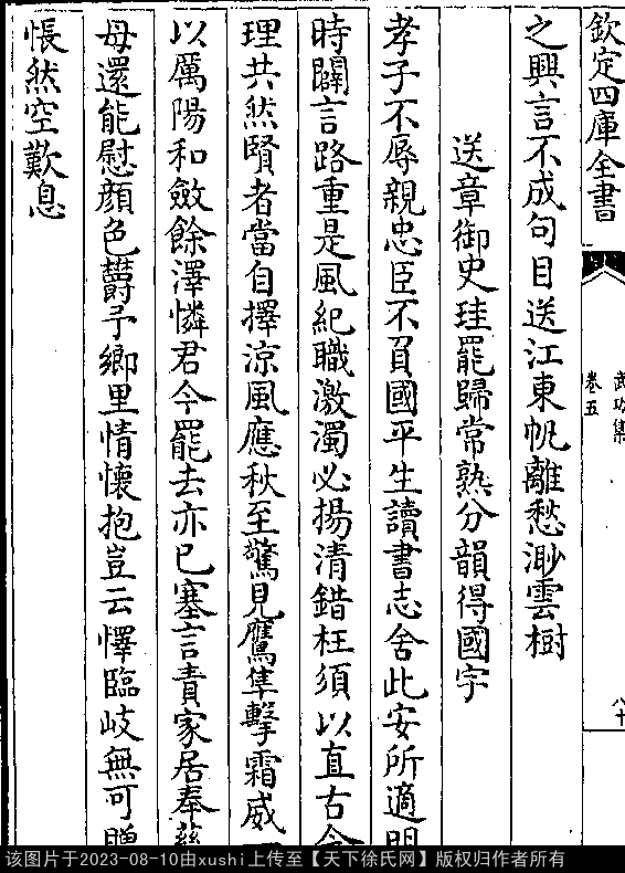 送章御史圭罢归常熟分韵得国字 明 · 徐有贞 押词韵第十七部 出处:吴都文粹续集卷五十一 孝子不辱亲,忠臣不负国。 平生读书志,舍此安所适。 明时辟言路,重是风纪职。 激浊必扬清,错枉须以直。 古今理共然,贤者当自择。 凉风应秋至,惊见鹰隼击。 霜威一以厉,阳和敛馀泽。 怜君今罢去,亦已塞言责。 家居奉慈母,还能慰颜色。 郁予乡里情,怀抱岂云怿。 临岐无可赠,怅然空叹息。 出处: 《武功集-明-徐有貞》卷五(第 80b - 81a 頁)