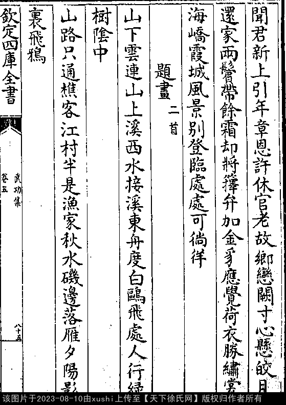 题画二首 其一 明 · 徐有贞 六言诗 押东韵 出处:明诗纪事 乙签·卷十六 山下云连山上,溪西水接溪东。 舟度白鸥飞处,人行绿树阴中。 其二 六言诗 押麻韵 山路只通樵客,江村半是渔家。 秋水矶边落雁,夕阳影里飞鸦。 出处: 《武功集-明-徐有貞》卷五(第 85a - 85b 頁)