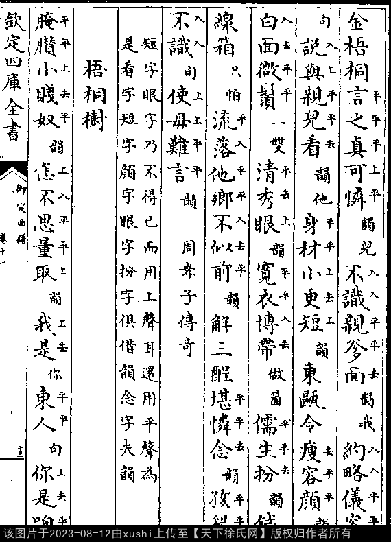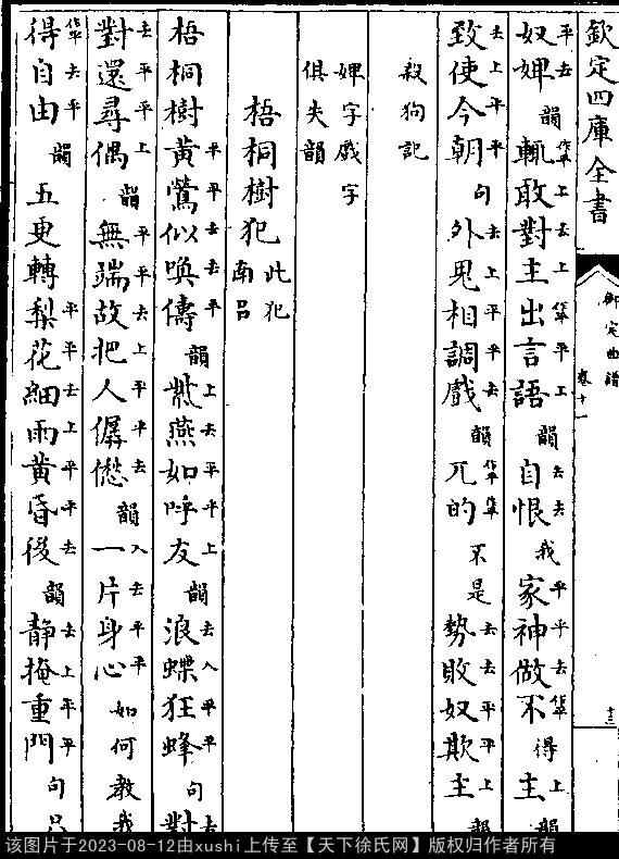 梧桐树 明 · 徐𤱻 出处:六十种曲 杀狗记 第二十二出 小生:腌臜小贱奴。怎不思量取。 我是你东人。你是咱奴婢。 辄敢对主出言语。自恨我家神做不得主。 致使今朝外鬼相调戏。兀的不是势败奴欺主。 出处: 《御定曲譜-清-王奕清》卷十一(第 13a - 14a 頁)
