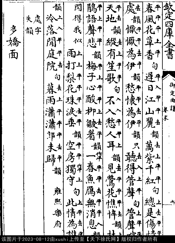 多娇面 明 · 徐𤱻 押轸韵 出处:御定曲谱、六十种曲 杀狗记 第二十二出 丑跪介:见官人忠孝心。思量后口头忒紧。 不合出言伤触了大人。如今悔之不尽。 出处: 《御定曲譜-清-王奕清》卷末(第 8a - 8b 頁)