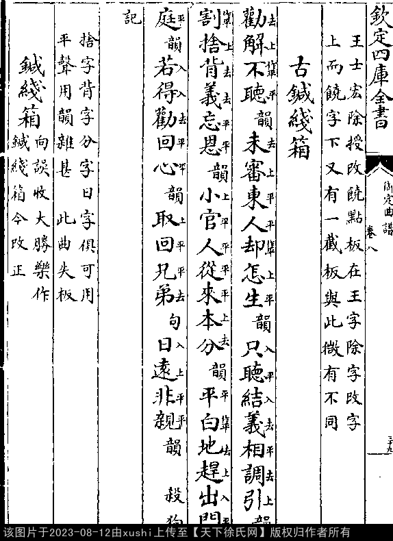 古针线厢 明 · 徐𤱻 出处:御定曲谱、六十种曲 杀狗记 第二十出 劝解不听。 未审东人却怎生。 只听结义相调引。 割舍背义忘恩。 小官人从来本分。 平白地赶出门庭。 合:若得劝回心。 取回兄弟。 永远和顺。 出处: 《御定曲譜-清-王奕清》卷八(第 39b - 40a 頁)