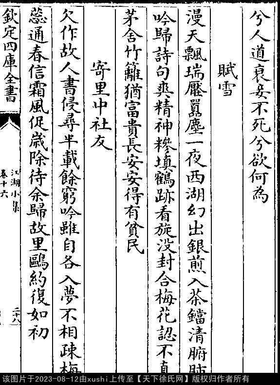 寄里中社友 南宋 · 徐集孙 五言律诗 押鱼韵 欠作故人书,侵寻半载馀。 穷吟虽各自,入梦不相疏。 梅蕊通春信,霜风促岁除。 待余归故里,鸥约复如初。 出处: 《江湖小集-宋-陳起》卷十六(第 28a - 28b 頁)