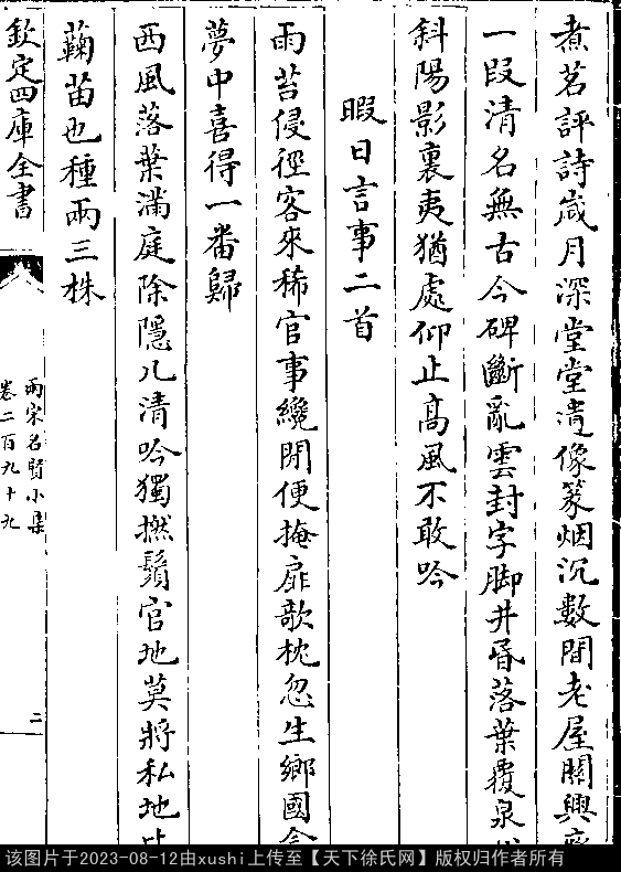 暇日言事二首 其一 南宋 · 徐集孙 七言绝句 押微韵 雨苔侵径客来稀,官事才閒便掩扉。 攲枕忽生乡国念,梦中喜得一番归。 其二 七言绝句 押虞韵 西风落叶满庭除,隐几清吟独撚须。 官地莫将私地比,菊苗也种两三株 出处: 《兩宋名賢小集-宋-陳思》卷二百九十九(第 2a - 2b 頁)