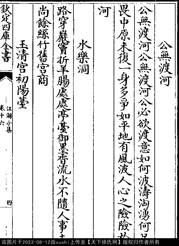公无渡河 南宋 · 徐集孙 押歌韵 公无渡河,公无渡河,公必欲渡意如何。 波涛汹涌何足畏,中原未复一身多。 争知(群贤集作如)平地有风波,人心之险险于河。 出处: 《江湖小集-宋-陳起》卷十六(第 4a - 4b 頁)