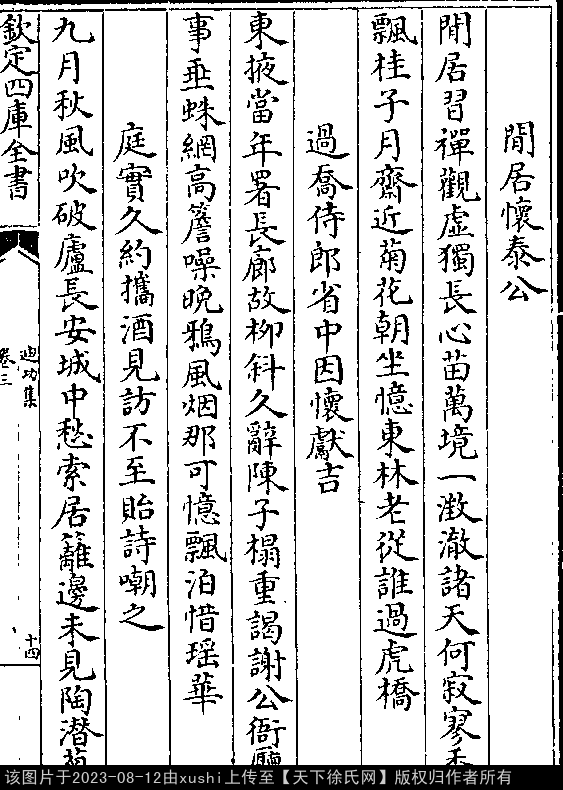 閒居怀泰公 明 · 徐祯卿 五言律诗 押萧韵 閒居习禅观,虚独长心苗。 万境一澄澈,诸天何寂寥。 香飘桂子月,斋近菊花朝。 坐忆东林老,从谁过虎桥。 出处: 《迪功集-明-徐禎卿》卷三(第 14a - 14b 頁)