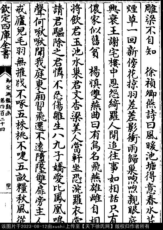 燕 明 · 徐祯卿 七言律诗 押真韵 风暖池塘得意春,水芹烟草一回新。 傍花掠羽差差影,冲雨归巢煦煦亲。 眼底兴衰王谢宅,楼中思怨绮罗人。 闲追往事如相话,只有侬家似旧贫。 出处: 《御定淵鑑類函-清-張英》御定淵鑑類函 卷四百二十四(第 41a - 41b 頁)