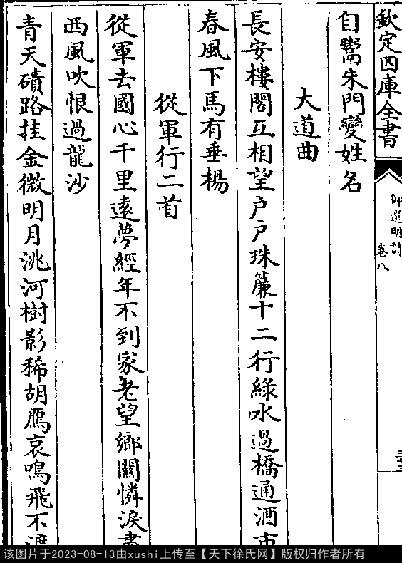 大道曲 明 · 徐祯卿 七言绝句 押阳韵 长安楼阁互相望,户户珠帘十二行。 绿水过桥通酒市,春风下马有垂杨。 出处: 《御選宋金元明四朝詩-清-聖祖玄燁》御選宋金元明四朝詩 御選明詩卷八(第 33b - 34a 頁)