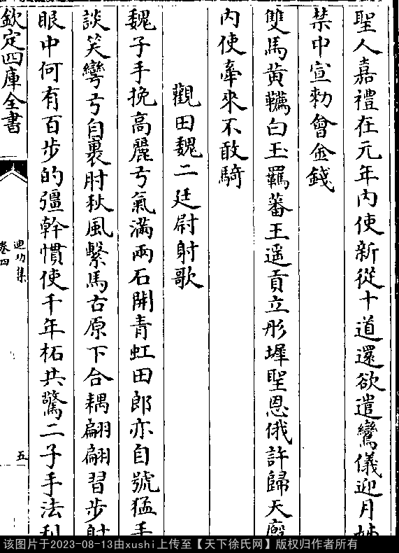 偶述二绝句 其一 明 · 徐祯卿 七言绝句 押先韵 圣人嘉礼在元年,内使新从十道还。 欲遣鸾仪迎月姊,禁中宣敕会金钱。 其二 七言绝句 押支韵 双马黄鞯白玉羁,蕃王遥贡立彤墀。 圣恩俄许归天厩,内使牵来不敢骑。 出处: 《迪功集-明-徐禎卿》卷四(第 5a - 5b 頁)