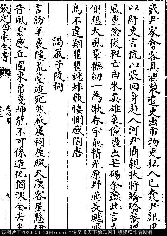 谒严子陵祠 明 · 徐祯卿 五言排律 押先韵 言访羊裘隐,荒台迹宛然。 岩崖祠屋缀,天汉客星悬。 伊昔风云感,丘园束帛戋。 神龙不可系,造化独深全。 去矣孤踪邈,怀哉大泽偏。 钓竿何袅袅,石濑故溅溅。 郡以高名著,山依汗简传。 馀风犹激懦,圣代更招贤。 圭组谁怜辱,襟期本尚玄。 终焉赴空谷,寤寐白驹篇。 出处: 《迪功集-明-徐禎卿》卷二(第 9a - 10a 頁)