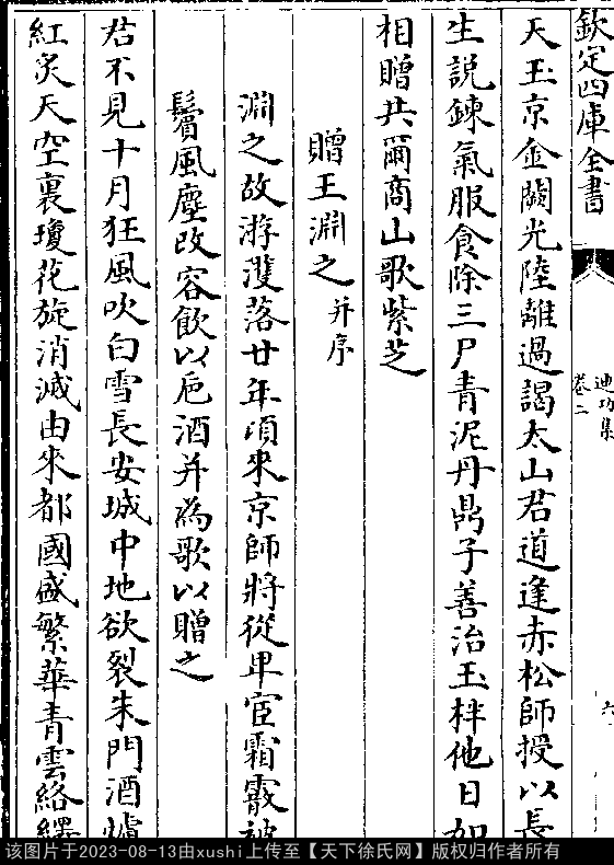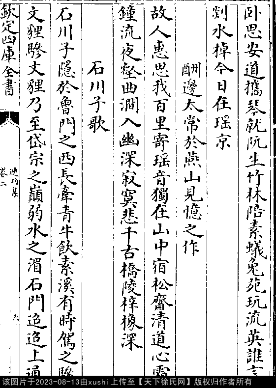 石川子歌 明 · 徐祯卿 押词韵第三部 石川子,隐于鲁门之西。 长牵青牛饮素溪,有时驾之骖文狸。 骖文狸,乃至岱宗之巅,弱水之湄。 石门迢迢上通天,玉京金阙光陆离。 过谒太山君,道逢赤松师。 授以长生说,鍊气服食除三尸。 青泥丹鼎子善治,玉柈他日如相赠,共尔商山歌紫芝。 出处: 《迪功集-明-徐禎卿》卷二(第 6a - 7a 頁)
