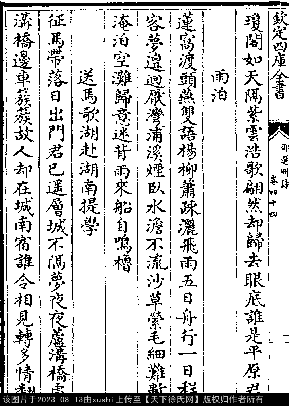 雨泊 明 · 徐祯卿 押麌韵 莲窝渡头燕双语,杨柳萧疏洒飞雨。 五日舟行一日程,客梦邅回厌湾浦。 溪烟卧水澹不流,沙草萦毛细难数。 淹泊空滩归意迷,背雨来船自鸣橹。 出处: 御選宋金元明四朝詩-清-聖祖玄燁》御選宋金元明四朝詩 御選明詩卷四十四(第 1b - 2a 頁)