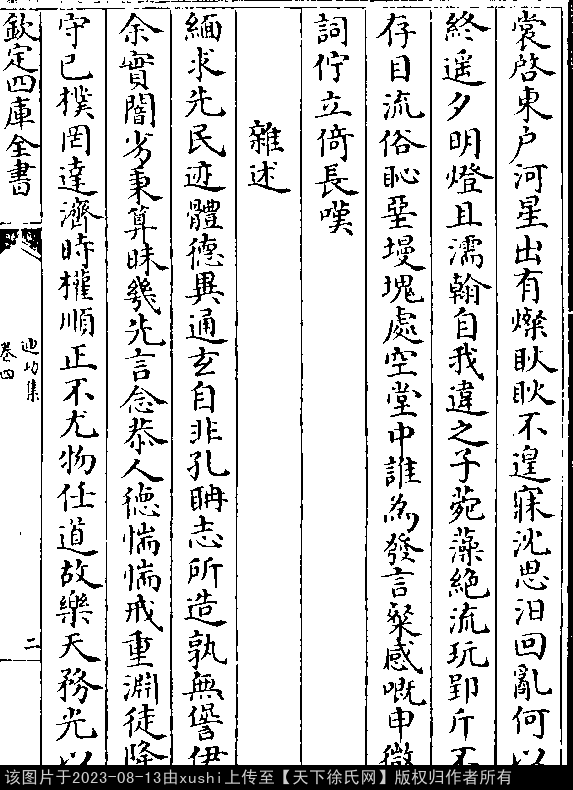 杂述 明 · 徐祯卿 押先韵 缅求先民迹,体德异通玄。 自非孔聃志,所造孰无愆。 伊余实闇劣,秉算昧几先。 言念恭人德,惴惴戒重渊。 徒隆守已朴,罔达济时权。 顺正不尤物,任道故乐天。 务光以洁湛,梅生智自全。 箕子狂为奴,何必屈父贤。 未周群物情,且复徇已偏。 人命几何时,金石忽以迁。 永言保贞素,庶明松柏坚。 眷念携手益,用嗣北风篇。 出处: 《迪功集-明-徐禎卿》卷四(第 2a - 3a 頁)