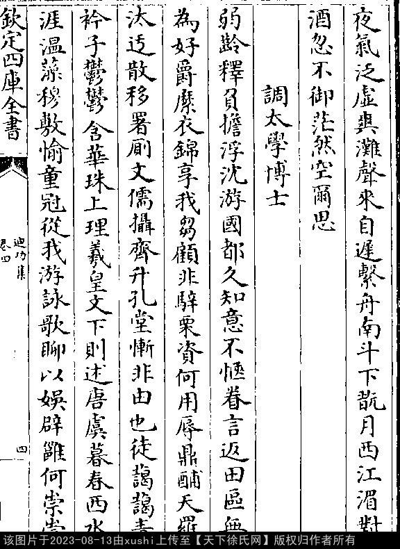 调太学博士 明 · 徐祯卿 押虞韵 弱龄释负担,浮沈游国都。 久知意不惬,眷言返田区。 无为好爵縻,衣锦享我刍。 顾非骍栗资,何用辱鼎酺。 天罗汰迂散,移署厕文儒。 摄齐升孔堂,惭非由也徒。 蔼蔼青衿子,郁郁含华珠。 上理羲皇文,下则述唐虞。 暮春西水涯,温藻穆敷愉。 童冠从我游,咏歌聊以娱。 辟雍何崇崇,崇崇丽天枢。 周王亮有造,贤者济弘图。 小子发斯谣,聊与击壤俱。 出处: 《迪功集-明-徐禎卿》卷四(第 4a - 5a 頁)