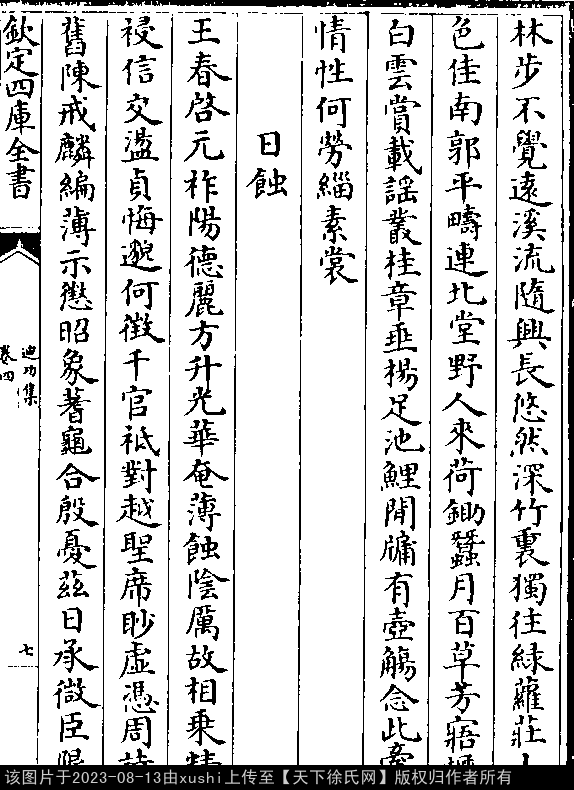 日蚀 明 · 徐祯卿 押蒸韵 王春启元祚,阳德丽方升。 光华奄薄蚀,阴厉故相乘。 精祲信交荡,贞悔邈何徵。 千官祗对越,圣席眇虚凭。 周诗旧陈戒,麟编薄示惩。 昭象蓍龟合,殷忧兹日承。 微臣限江汉,延伫意何胜。 出处: 《迪功集-明-徐禎卿》卷四(第 7a - 8a 頁)