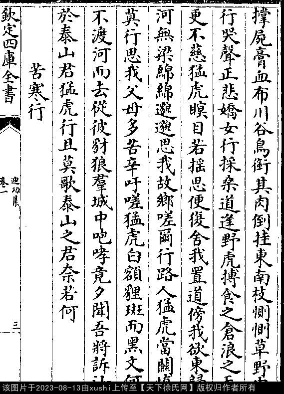 榆台行(按榆台战在弘治乙丑年) 明 · 徐祯卿 榆台高以临匈奴,匈奴之罪当夷。 战不利,师被围。 师被围,士无粮,渴无浆。 拔剑仰天诀,壮士饿死亡。 弃尸不保,蹂藉道傍。 嗟尔从军之人,行不来归。 奈之何,心伤悲。 出处: 《迪功集-明-徐禎卿》卷一(第 3b - 4b 頁)