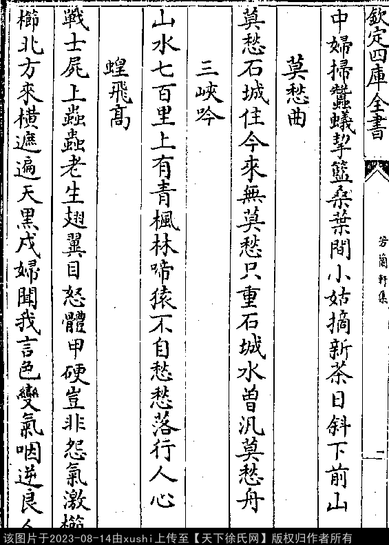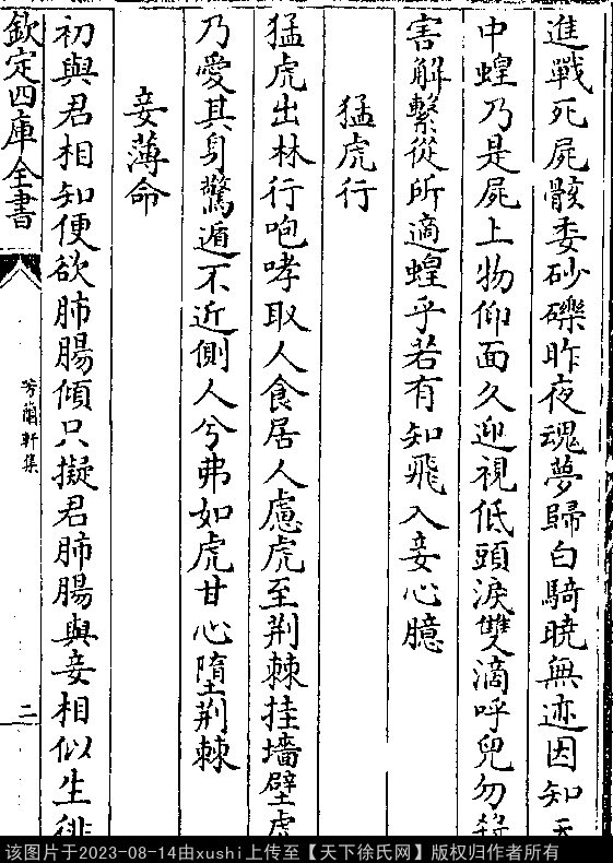 猛虎行 南宋 · 徐照 押词韵第十七部 猛虎出林行,咆哮取人食。 居人虑虎至,荆棘挂墙壁。 虎乃爱其身,惊遁不近侧。 人兮不(《诗渊》册四页二七一三作苦弗)如虎,甘心堕荆棘。 出处: 《二薇亭詩集-宋-徐璣》芳蘭軒集 芳蘭軒集(第 2a - 2b 頁)