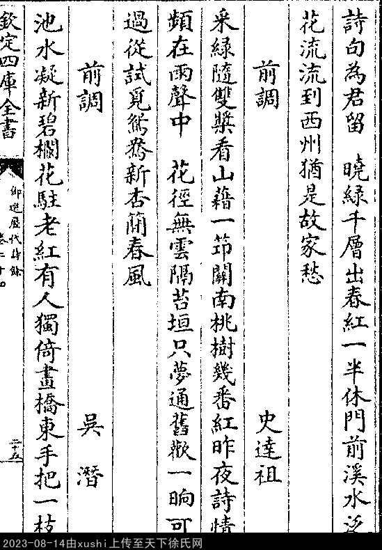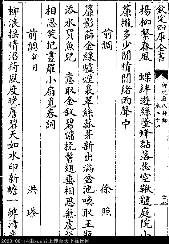 南歌子 南宋 · 徐照 押支韵 帘影筛金线,炉烟袅翠丝。 菰芽新出满盆池。 唤取玉瓶添水、买鱼儿。 意取钗重碧,慵梳髻翅垂。 相思无处说相思。 笑把画罗小扇、觅春词。 出处: 《御選歷代詩餘-清-聖祖玄燁》御選歷代詩餘 卷二十四目録(第 30b - 31a 頁)