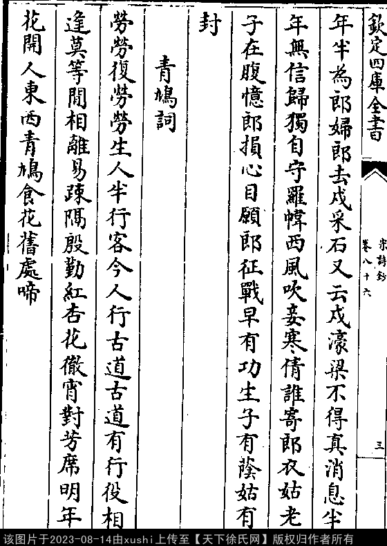 征妇思 南宋 · 徐照 年半为郎妇,郎去戍采石。 又云戍濠梁,不得真消息。 半年无信归,独自守罗帏。 西风吹妾寒,倩谁寄郎衣。 姑老子在腹,忆郎损心目。 愿郎征战早有功,生子有荫姑有封。 出处: 《宋詩鈔-清-吳之振》卷八十六(第 3b - 4a 頁)