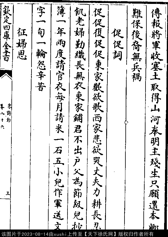 促促词 南宋 · 徐照 促促复促促,东家欢欲歌,西家悲欲哭。 丈夫力耕长忍饥,老妇勤织长无衣。 东家铺兵不出户,父为节级儿抄簿。 一年两度请官衣,每月请米一石五。 小儿作军送文字,旬日一轮怨辛苦。 出处: 《宋詩鈔-清-吳之振》卷八十六(第 3a - 3b 頁)