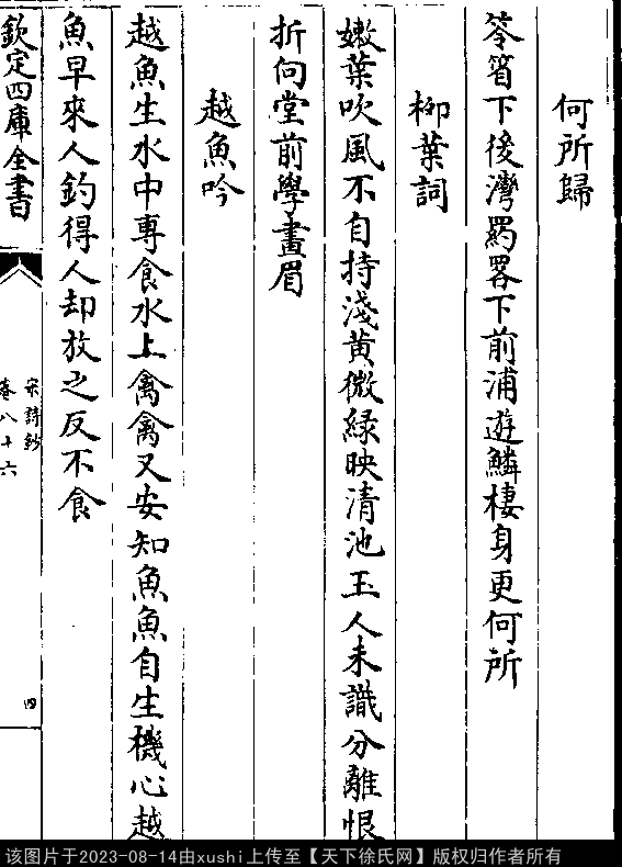 越鱼吟(沅水有越鱼,飞攫禽类以食) 南宋 · 徐照 越鱼生水中,专食水上禽。 禽又安知鱼,鱼自生机心。 越鱼早来人钓得,人却放之反不食(自“鱼自生”下原残缺一页,十六字据明本、顾本补)。 出处: 《宋詩鈔-清-吳之振》卷八十六(第 4a - 4b 頁)