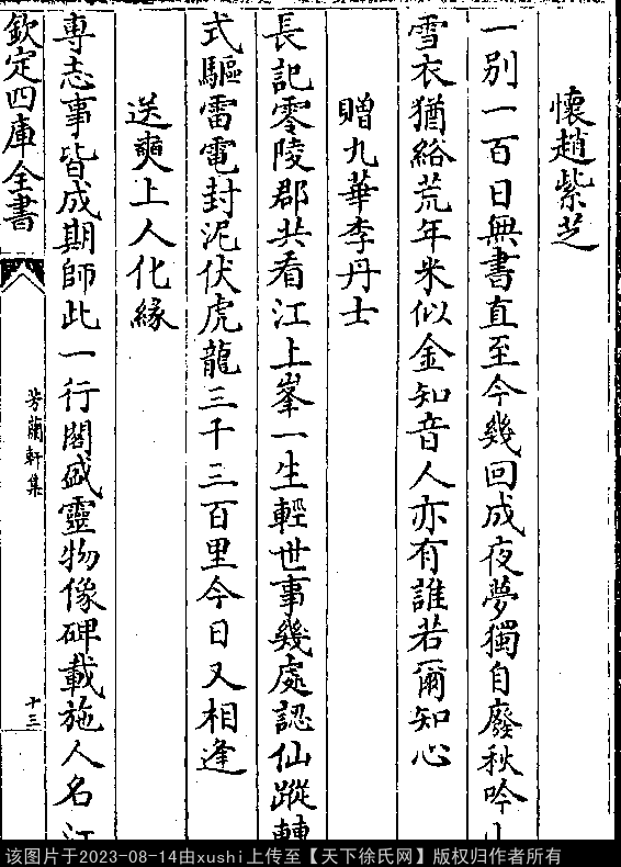 赠九华李丹士(影印《诗渊》册一页四一六作徐玑诗) 南宋 · 徐照 五言律诗 押冬韵 长记零陵郡,共看江上峰。 平(明本、顾本作一)生轻世事,几度(明本、顾本作处)认仙踪。 转式驱雷电,封泥伏虎龙。 三千三百里,今日又相逢。 出处: 《二薇亭詩集-宋-徐璣》芳蘭軒集 芳蘭軒集(第 13a - 13b 頁)