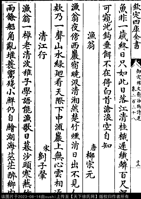 分题得渔村晚照 南宋 · 徐照 渔师得鱼绕溪卖,小船横系柴门外。 出门老妪唤鸡犬,收敛蓑衣屋头晒。 卖鱼得酒又得钱,归来醉倒地上眠。 小儿啾啾问煮米,白鸥飞去芦花烟。 出处: 《御定佩文齋詠物詩選-清-張玉書》卷二百二十八(第 13a - 13b 頁)