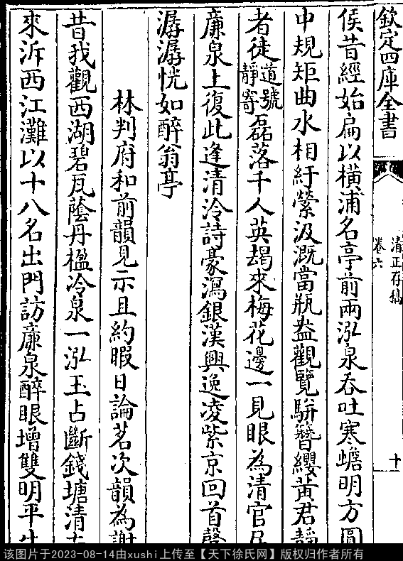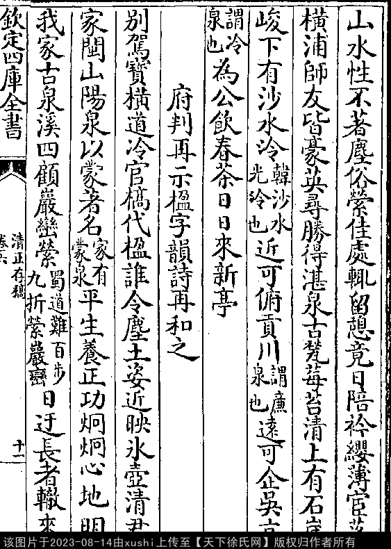 林判府和前韵见示且约暇日论茗次韵为谢 南宋 · 徐鹿卿 昔我观西湖,碧瓦荫丹楹。 冷泉一泓玉,占断钱塘清。 南来溯西江,滩以十八名。 出石访廉泉,醉眼增双明。 平生山水性,不着尘俗萦。 佳处辄留憩,竟日陪衿缨。 薄宦落横浦,师友皆豪英。 寻胜得湛泉,古甃莓苔青。 上有石崖峻,下有沙水冷(自注:韩沙水光冷也。)。 近可俯贡川(自注:谓廉泉也。),远可企吴京(自注:谓冷泉也。)。 为公饮春茶,日日来新亭。 出处: 《清正存稿-宋-徐鹿卿》卷六(第 10b - 11b 頁)