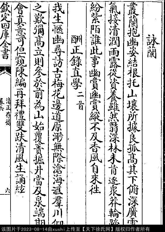 咏兰 南宋 · 徐鹿卿 押养韵 丛兰抱幽姿,结根托山壤。 所据良孤高,其下俯深广。 云气接清润,雨露从资养。 虽然翳深林,未肯群众莽。 轮蹄纷紫陌,谁此事幽赏。 幽赏纵不及,香风自来往。 出处: 《清正存稿-宋-徐鹿卿》卷六(第 6a - 6b 頁)