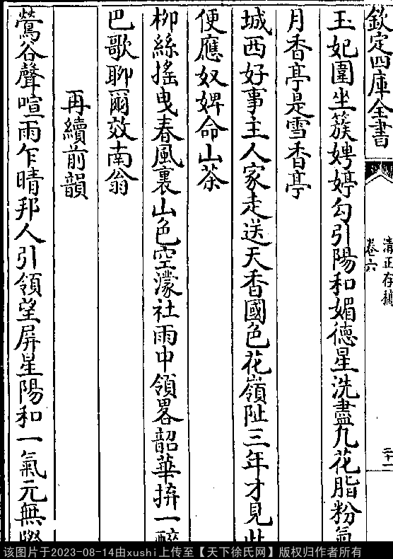 再续前韵 其一 南宋 · 徐鹿卿 七言绝句 押青韵 莺谷声喧雨乍晴,邦人引领望屏星。 阳和一气元无际,小为寻花到野亭。 其二 七言绝句 押麻韵 荷囊清白旧传家,来看溶溶月下花。 不似寻常杀风景,也宜饮酒也宜茶。 其三 七言绝句 押词韵第一部 笔端鸾凤诗千首,社下鸡豚酒一钟。 九十日春今强半,典衣还忆少陵翁。 出处: 《清正存稿-宋-徐鹿卿》卷六(第 21b - 22b 頁)