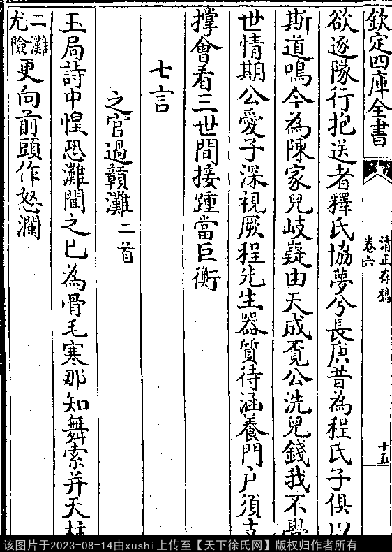 雨霁报谒见一鹭得鱼群鹭争食之 其一 南宋 · 徐鹿卿 七言绝句 押微韵 一鹭翩翩傍钓矶,隔汀群鹭已知机。 空将辛苦供群吻,毕竟贪鱼罪有归。 其二 七言绝句 押歌韵 履崄窥鱼得几何,傍来攫取较多多。 争如敛翼餐馀粟,犹在人间洁白科。 出处: 《清正存稿-宋-徐鹿卿》卷六(第 16a - 16b 頁)