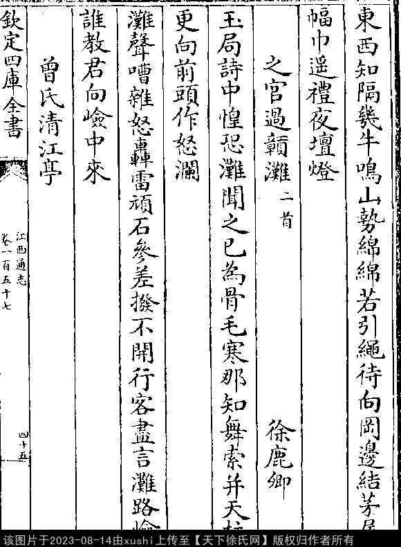 之官过赣滩(二首(原注:以下诗初官南安军时作。)) 其一 南宋 · 徐鹿卿 七言绝句 押寒韵 玉局诗中皇恐滩,闻之已为骨毛寒。 那知舞索并天柱(自注:二滩尤崄。),更向前头作怒澜。 其二 七言绝句 押灰韵 滩声嘈杂怒轰雷,顽石参差拨不开。 行客尽言滩路崄,谁教君向崄中来。 出处: 《江西通志-清-謝旻》卷一百五十七(第 45a - 45b 頁)