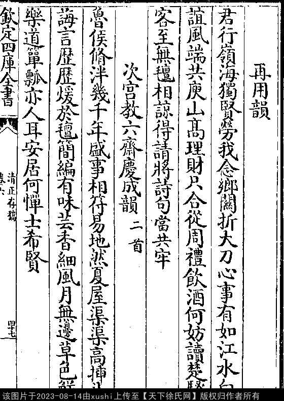 宫教再以诗来复次韵 南宋 · 徐鹿卿 七言律诗 押先韵 蚤负才名四十年,胸中成室总天然。 承流且建偏州学,谈道终分广厦毡。 椽笔发挥春藻丽,鸾旂照映雪花鲜。 几人鱼跃鸢飞下,黄卷生涯对圣贤。 出处: 《清正存稿-宋-徐鹿卿》卷六(第 47b - 48a 頁)