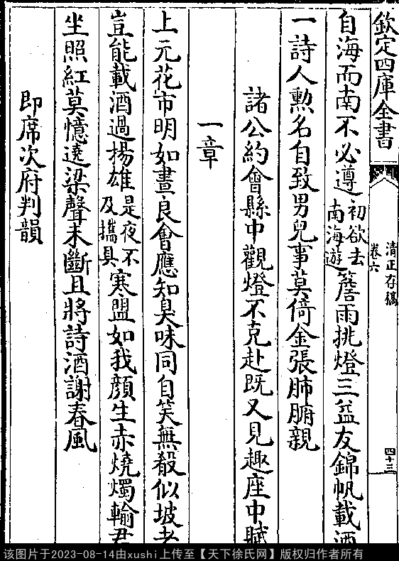 诸公约会县中观灯不克赴既又见趣座中赋一章 南宋 · 徐鹿卿 七言律诗 押东韵 上元花市明如昼,良会应知臭味同。 自笑无殽似坡老,岂能载酒过扬雄(自注:是夜不及携具。)。 寒盟如我颜生赤,烧烛输君坐照红。 莫忆绕梁声未断,且将诗酒谢春风。 出处: 《清正存稿-宋-徐鹿卿》卷六(第 43b - 44a 頁)