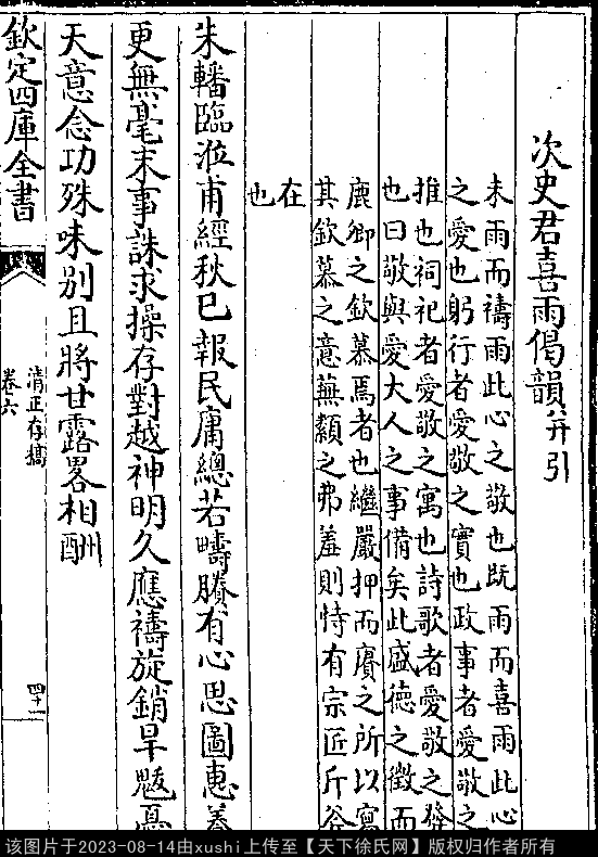 次史君喜雨偈韵(并引) 其一 南宋 · 徐鹿卿 七言律诗 押尤韵 朱轓临莅甫经秋,已报民庸总若畴。 剩有心思图惠养,更无毫末事诛求。 操存对越神明久,应祷旋销旱魃忧。 天意念功殊未别,且将甘露略相酬。 其二 七言律诗 押尤韵 田里欢传岁有秋,已占休證叶龟畴。 连朝霪雨忻从欲,一念通神只反求。 暂向岭边宣主泽,每先天下为民忧。 藩方久袖为霖手,百万苍生愿未酬。 出处: 《清正存稿-宋-徐鹿卿》卷六(第 41a - 41b 頁)