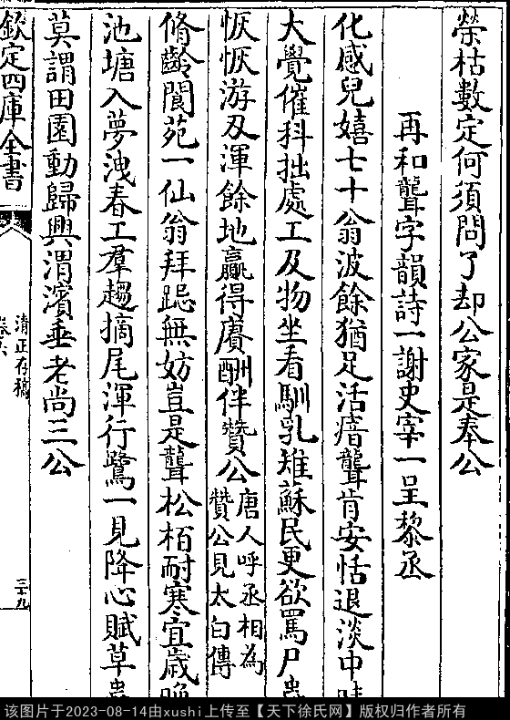 黎丞传示史宰聋字诗走笔和之 南宋 · 徐鹿卿 七言律诗 押东韵 毛颖翻成一秃翁,文章苦欲诳盲聋。 从前结实无非妄,胜处生涯好用工。 天上高深关守虎,马前奔走背生虫。 荣枯数定何须问,了却公家是奉公。 出处: 《清正存稿-宋-徐鹿卿》卷六(第 38b - 39b 頁)
