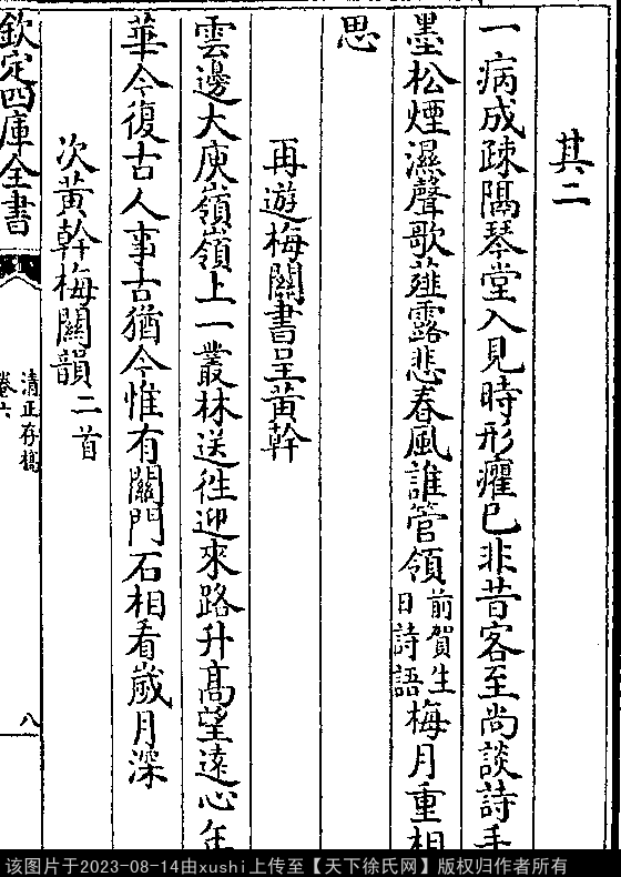 次黄干梅关韵 其一 南宋 · 徐鹿卿 五言律诗 押删韵 老卢行法地,千载复抽关。 崖石横双翠,禅机漏一斑。 两泉涵定慧(原作彗,据四库本改),半榻卧云閒。 着我谈风月,真成出世间。 其二 五言律诗 押齐韵 相逢白莲社,失脚过前溪。 野兴云横浦,禅心絮着泥。 梅花大庾岭,钵石古招提。 扰扰仕途梦,从前几个迷。 出处: 《清正存稿-宋-徐鹿卿》卷六(第 8b - 9a 頁)