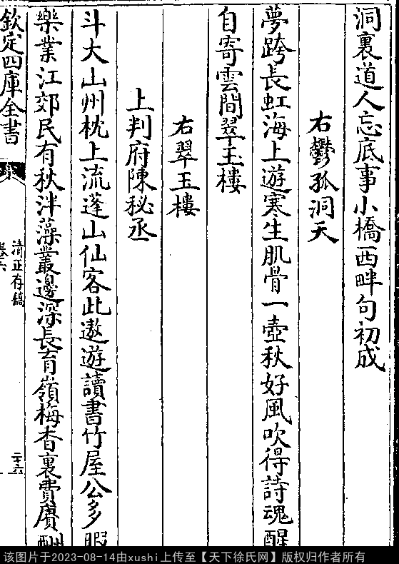 酬温户见和首篇 南宋 · 徐鹿卿 七言律诗 押尤韵 南来冠盖总名流,契合全忘是宦游。 清甚夜寒金井露,莹于霜晓玉壶秋。 梅关景物诗陶写,莲幕风流酒劝酬。 只恐乌罗留不住,汉庭山立看扬休。 出处: 《清正存稿-宋-徐鹿卿》卷六(第 26b - 27a 頁)