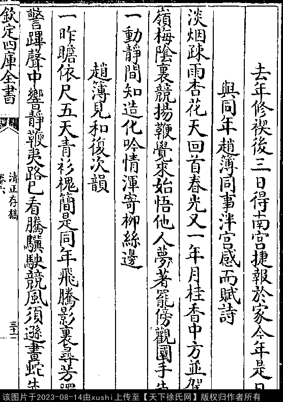 赵簿见和复次韵 南宋 · 徐鹿卿 七言律诗 押先韵 一昨瞻依尺五天,青衫槐简是同年。 飞腾影里寻芳躅,警跸声中响静鞭。 夷路已看腾骥駃,竞风须逊画蛇先。 宗臣底事犹栖棘,有策筹边不在边。 出处: 《清正存稿-宋-徐鹿卿》卷六(第 31a - 32a 頁)