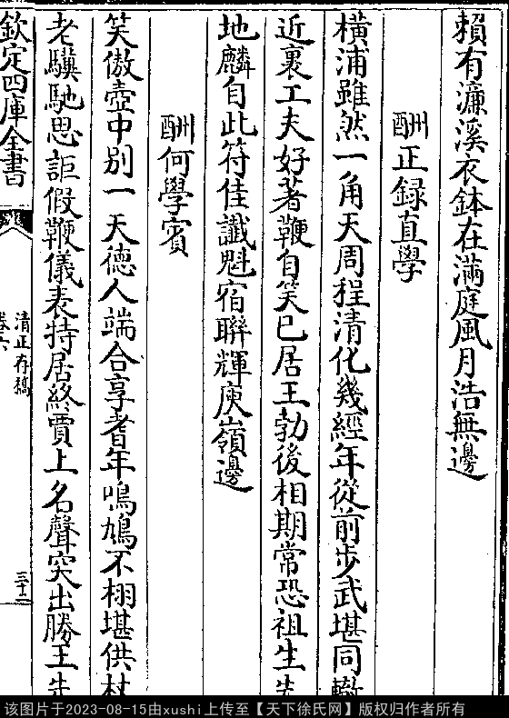酬何学宾 南宋 · 徐鹿卿 七言律诗 押先韵 笑傲壶中别一天,德人端合享耆年。 鸣鸠不栩堪供杖,老骥驰思渠假鞭。 仪表特居终贾上,名声突出胜黄先。 熊螭已入佳占未,明月清风渭水边。 出处: 《清正存稿-宋-徐鹿卿》卷六(第 32a - 33a 頁)