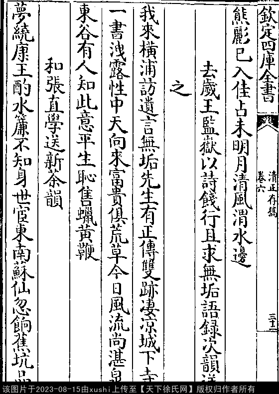 去岁王监岳以诗饯行且求无垢语录次韵送之 南宋 · 徐鹿卿 七言律诗 押先韵 我来横浦访遗言,无垢先生有正传。 双迹凄凉城下寺,一书泄露性中天。 向来富贵俱荒草,今日风流尚湛泉。 东谷有人知此意,平生耻售蜡黄鞭。 出处: 《清正存稿-宋-徐鹿卿》卷六(第 32b - 33a 頁)